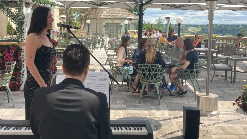 Cara and Emilio De Mercato, pianist and Music Director of Alberta Symphony Orchestra performed at the Fairmont Hotel Macdonald’s patio overlooking the river valley as part of Music in the Air on July 4.